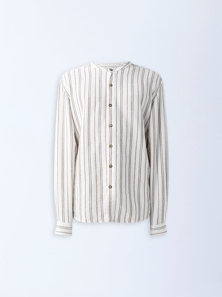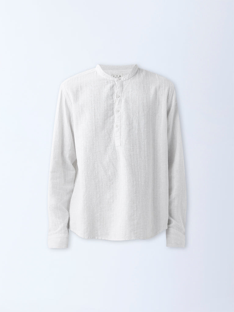 This off-white shirt from ETA brings quiet detail to the forefront with embroidered stripes that lend subtle texture. Spun from a breathable fabric and cut in a relaxed silhouette, it features full sleeves, a mandarin collar, and a button placket.