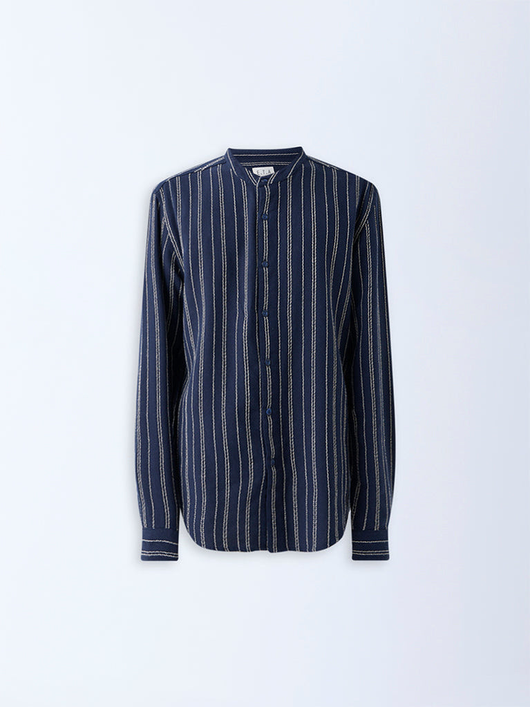This navy shirt from ETA is detailed with embroidered stripes that add depth without overwhelming the look. Created from a breathable fabric, it features a relaxed silhouette with full sleeves, a mandarin collar, and a button placket. A clean, modern option that works just as well for casual days as it does for low-key evenings.