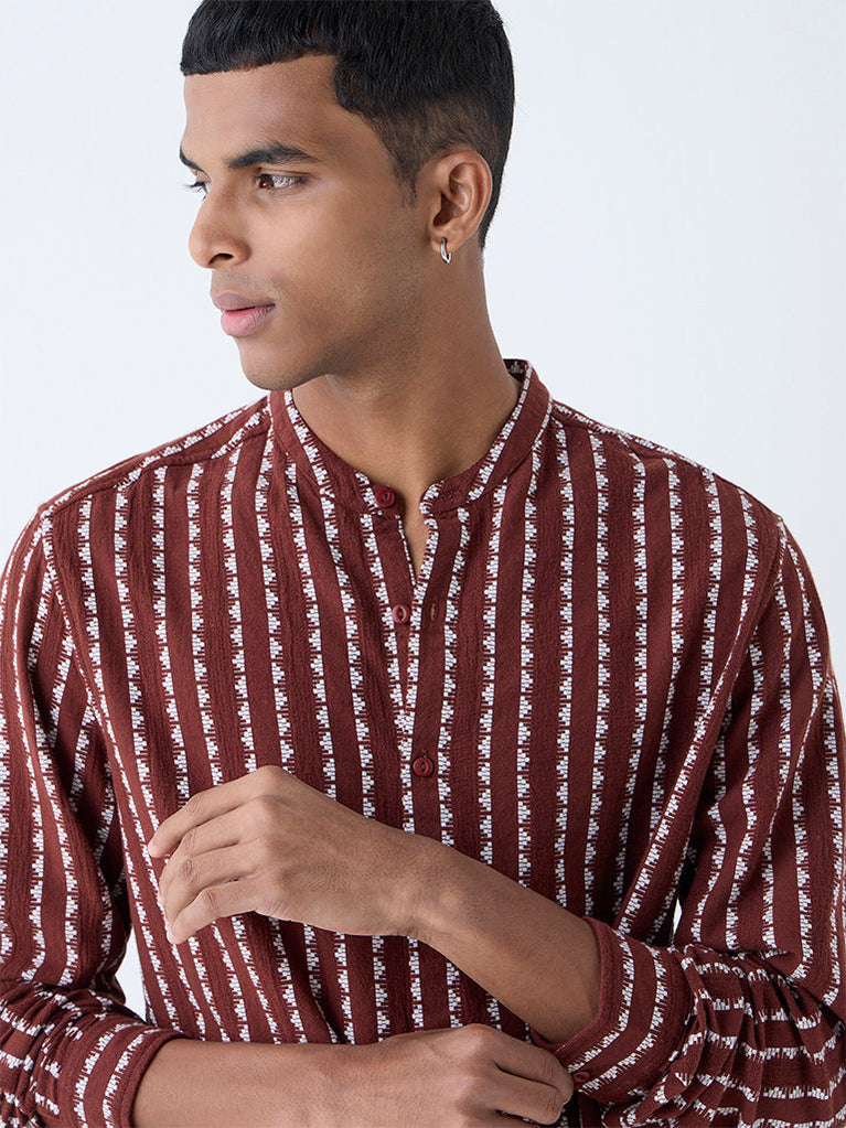 Fashioned for easy sophistication, this olive shirt from ETA showcases embroidered stripe patterns across a relaxed silhouette. Spun from pure cotton, it’s finished with a band-neck collar, full sleeves and a neat button placket for easy wear.