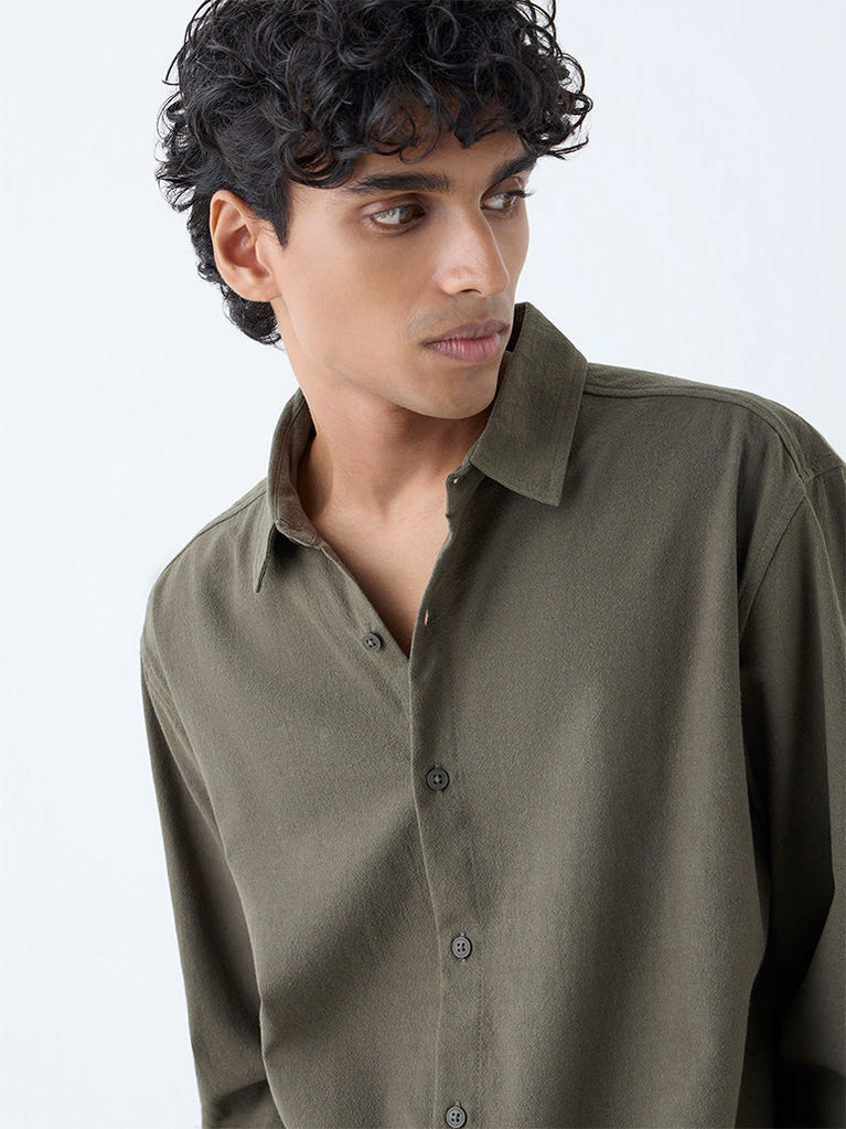 Designed to keep you comfortable from morning to night, this olive shirt from ETA is a refined off-duty staple. Cut in a relaxed silhouette and made from pure cotton, it offers all-day comfort. The spread collar, button placket, and full sleeves lend it a clean, put-together finish.