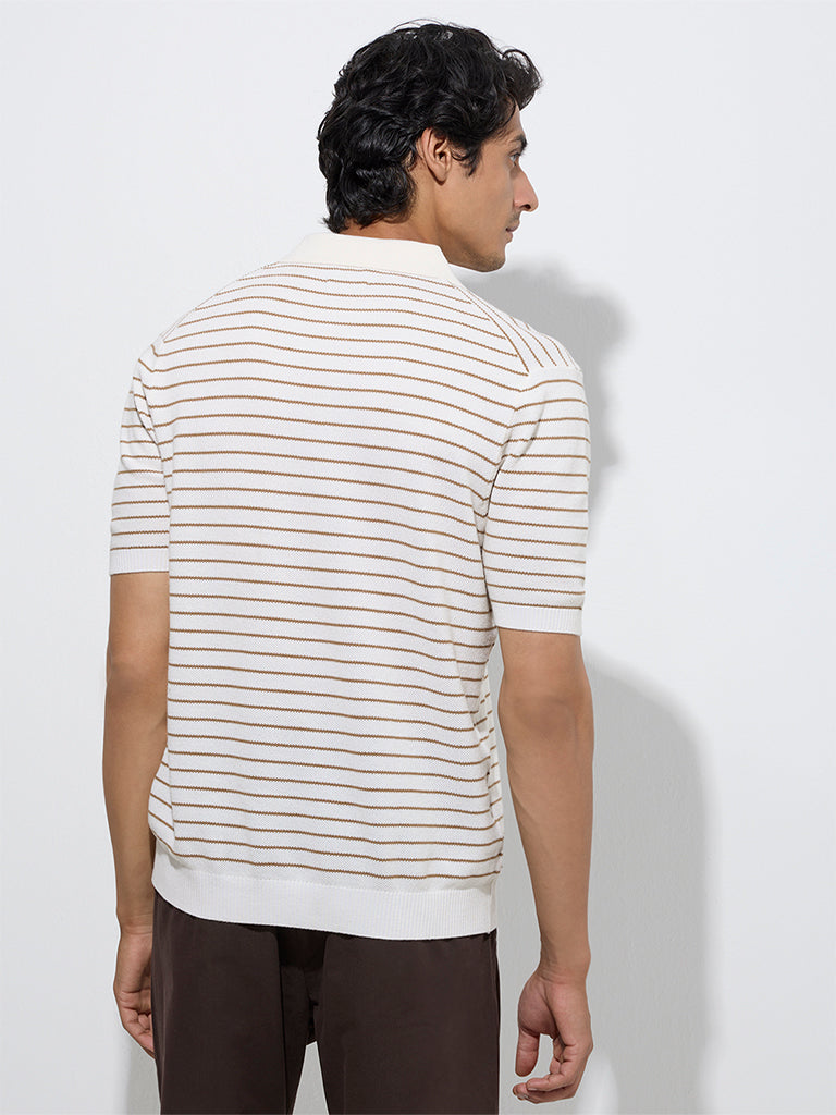 Ascot Taupe Stripe Relaxed-Fit Cotton-Blend Polo T-Shirt