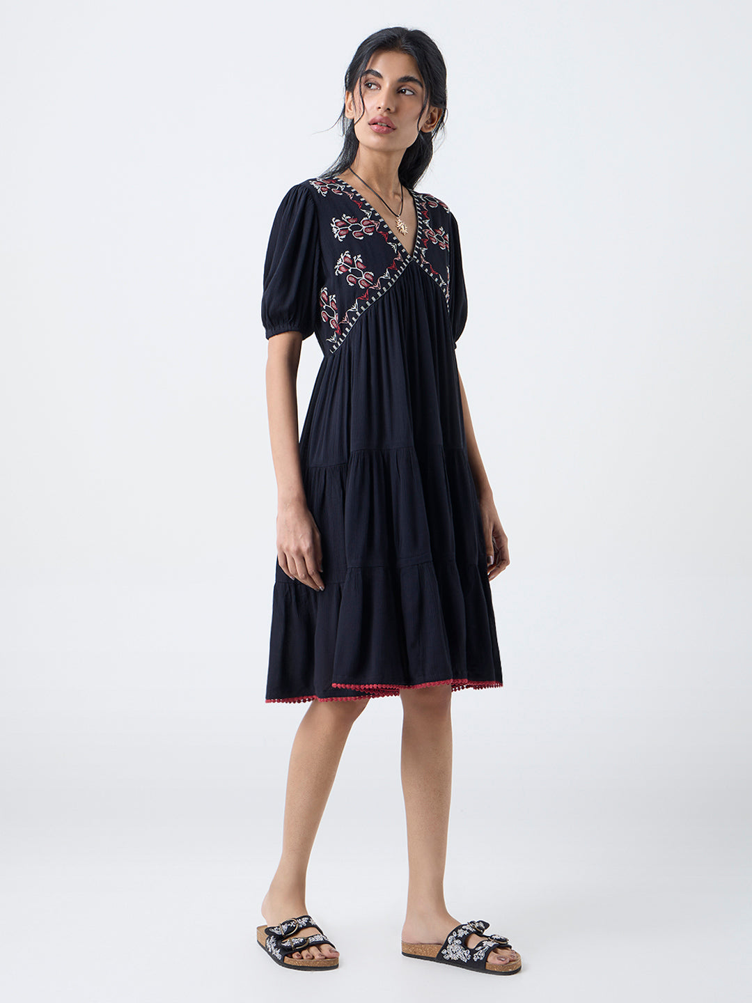 A blend of texture and tradition, this black dress from Bombay Paisley features intricate embroidery gracing the yoke, adding an artisanal dimension to its elegant shape. Crafted from a crinkle-textured fabric, the empire-line silhouette drapes with soft movement, framed by a V-neck and airy puff sleeves.