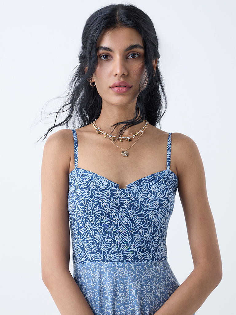 Bombay Paisley Dark Blue Printed Cotton Tiered Dress