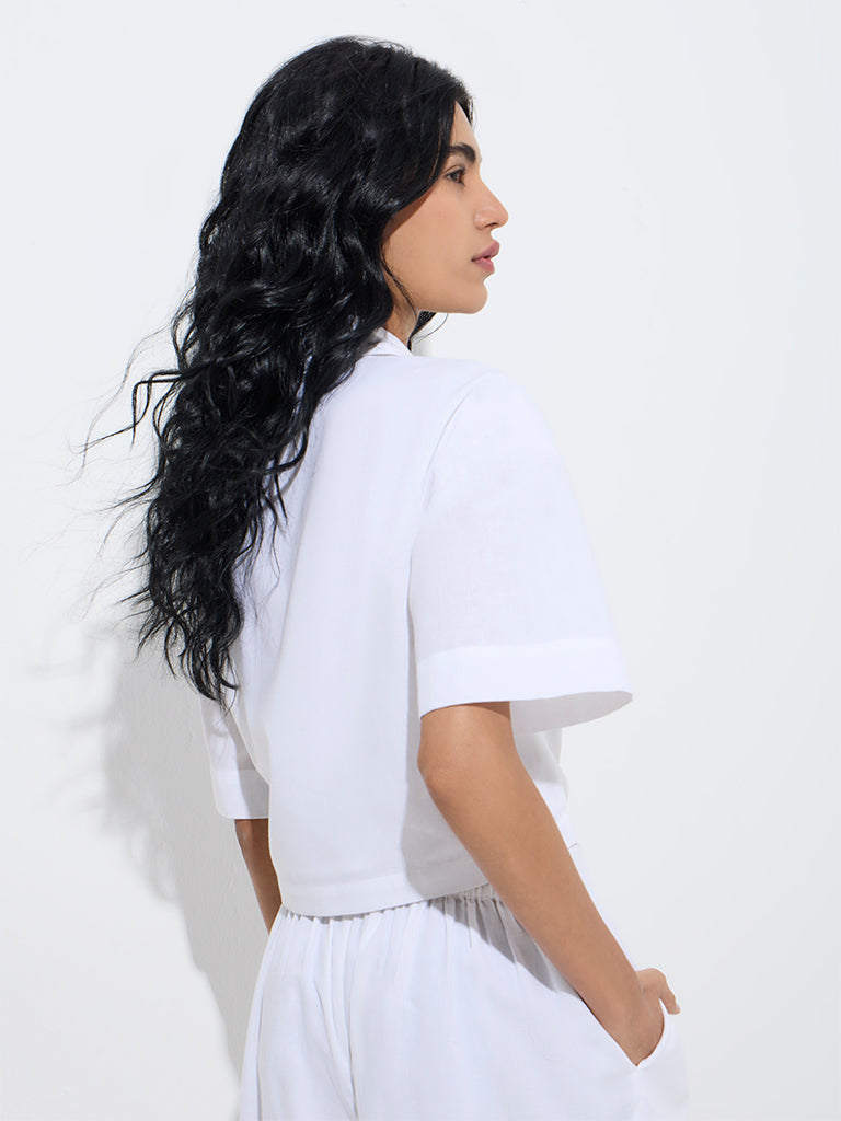 Bombay Paisley presents this ivory shirt showcasing nature-inspired prints for a breezy, daytime finish. Milled from a sumptuous cotton-linen blend, it features a notched lapel that extends into a button-up front, paired with half sleeves for a relaxed fit.