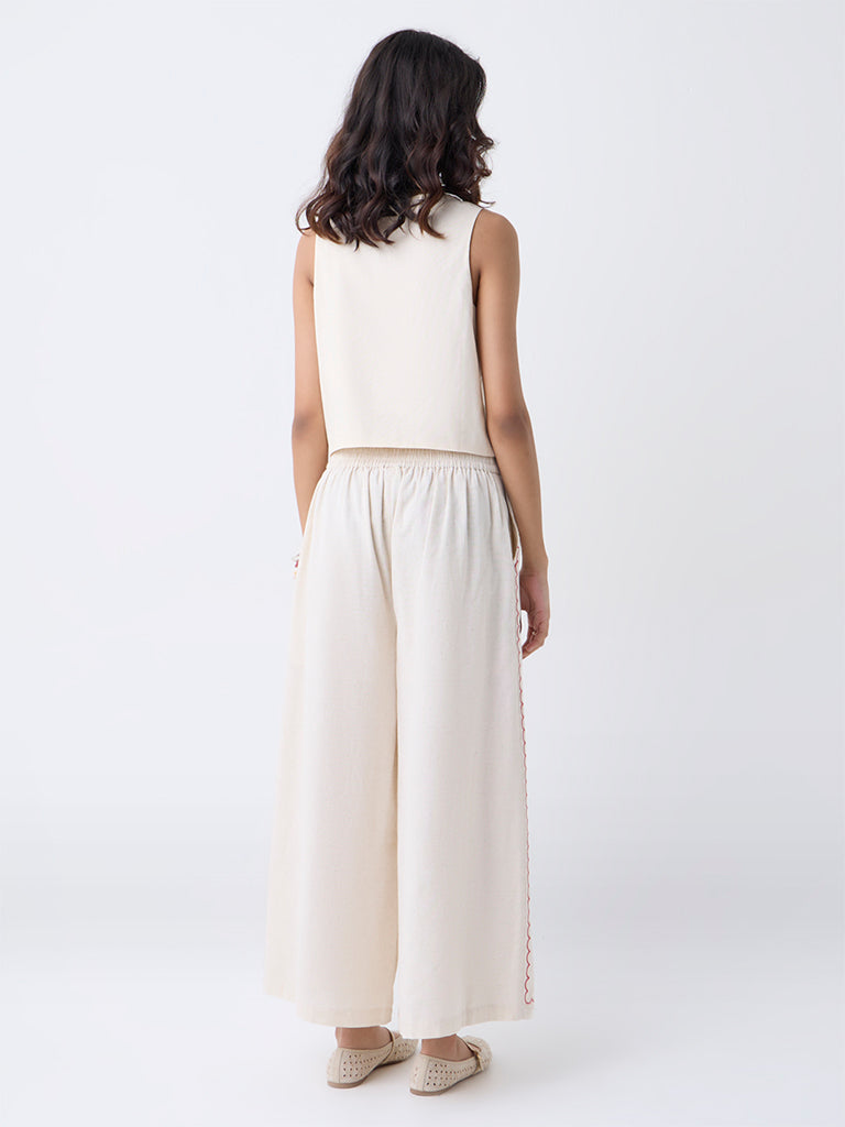 Made to be the focal point of your look, this Off-White waistcoat from Bombay Paisley is detailed with vivid embroidery for a structured yet artisanal appeal. Shaped with a V-neckline, button-up front and a sleeveless silhouette, it is crafted from a cotton-blend fabric that stays comfortable while adding definition to layered outfits.
