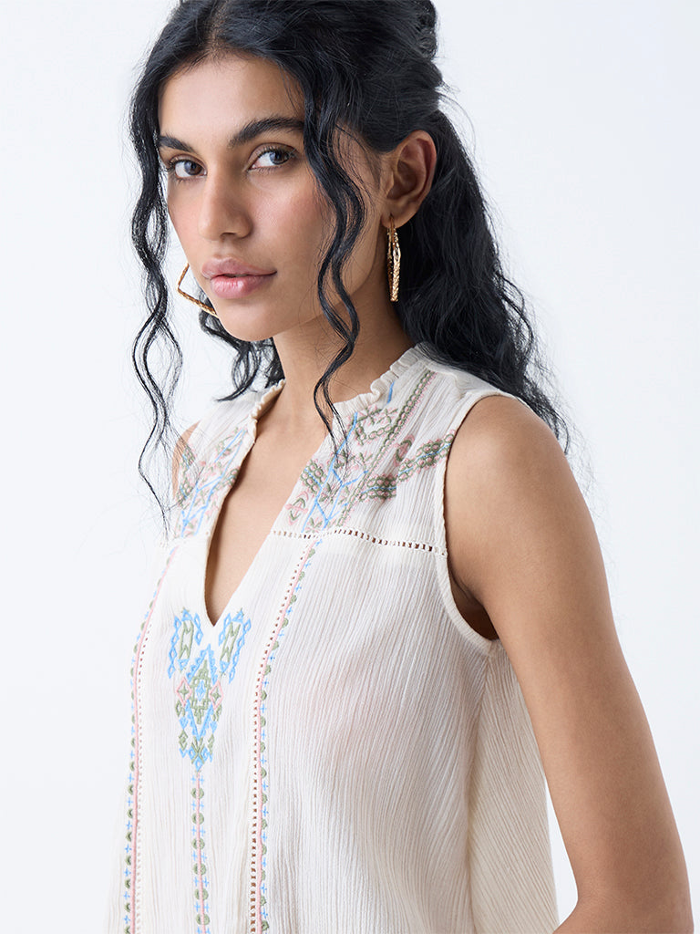 Enhance your style quotient with this off-white top from Bombay Paisley. Cross-stitch embroidery on a crinkle-textured layer brings subtle artistry, while a V-neck and sleeveless cut keep it breezy and modern. Constructed from a cotton-rich fabric, it offers superior comfort throughout the day.
