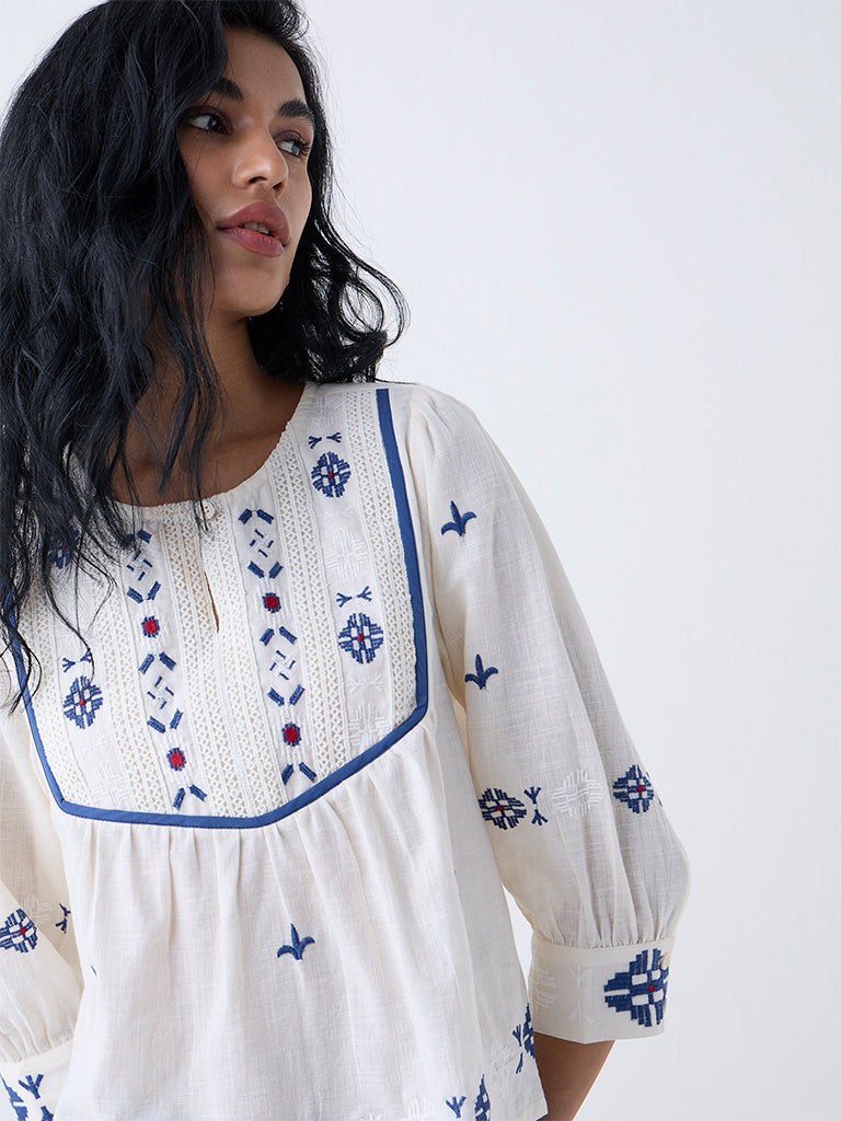 Delicate threadwork anchors this off-white top from Bombay Paisley, adding a subtle artisanal charm. The relaxed silhouette is framed with a round neck, a buttoned opening and gently gathered blouson sleeves finished with embroidered motifs. Woven from a cotton-rich fabric for day-long comfort, it’s a dependable pick for easy routines and soft, casual styling.