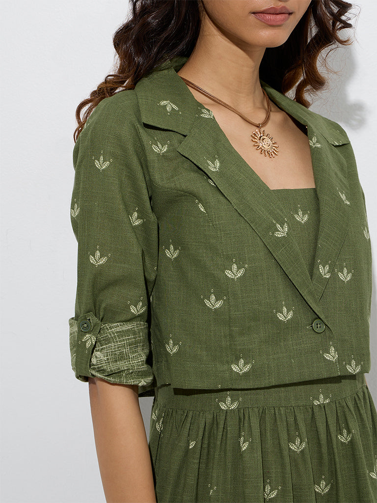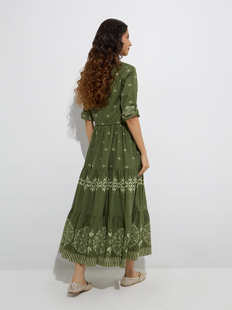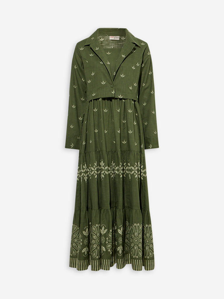 Bombay Paisley Olive Floral Cotton Tiered Dress with Jacket