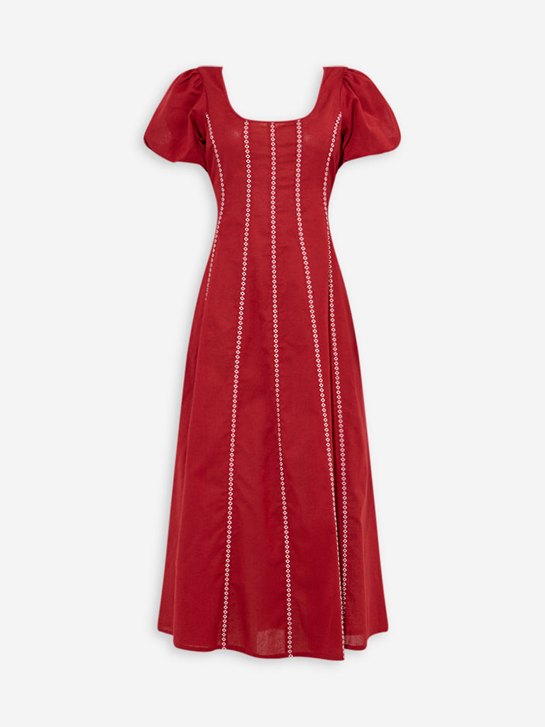 Shaped in a flattering A-line silhouette, this red dress from Bombay Paisley flaunts intricate embroidery that adds subtle artistry. Its breathable composition combines comfort with style, while a scoop neck, puff sleeves, and a back zipper ensure effortless wear.