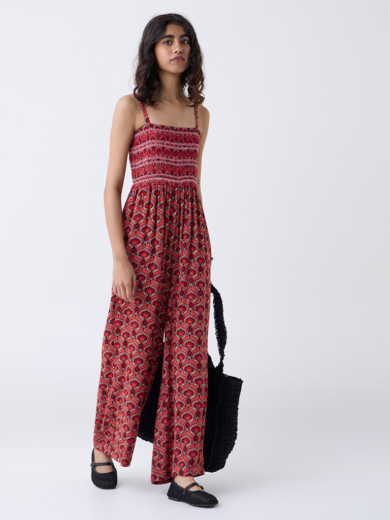When comfort meets statement style, this red jumpsuit from Bombay Paisley stands out with its vibrant prints and ethnic-inspired charm. Designed with a smocked bodice, it features a square neckline and adjustable straps for a flexible fit. Crafted from a soft cotton-blend fabric and finished with side pockets, it is an easy choice for relaxed yet elevated daywear.