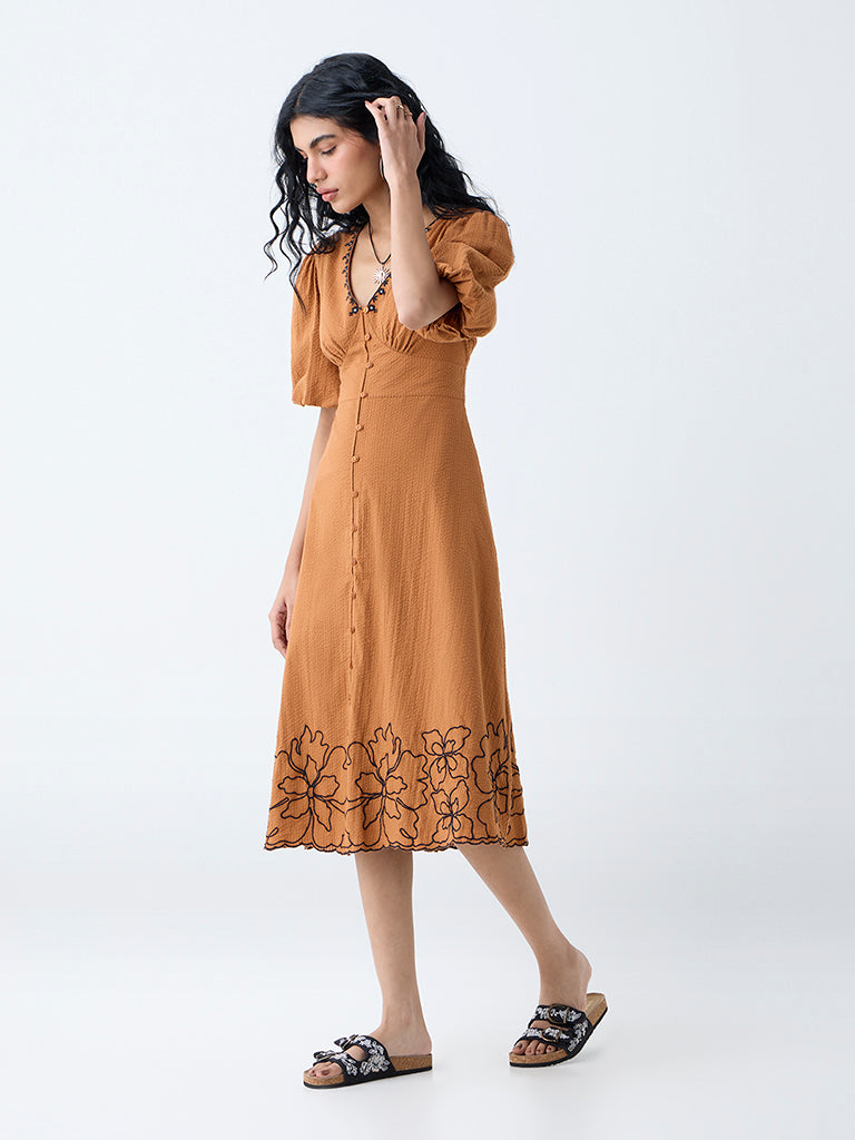 This tan dress from Bombay Paisley is fashioned for looks that can serve you from brunch to evenings out. Spun from a seersucker-textured fabric, it showcases floral embroidery near the hem, while the V-neck and balloon sleeves offer a flattering finish.