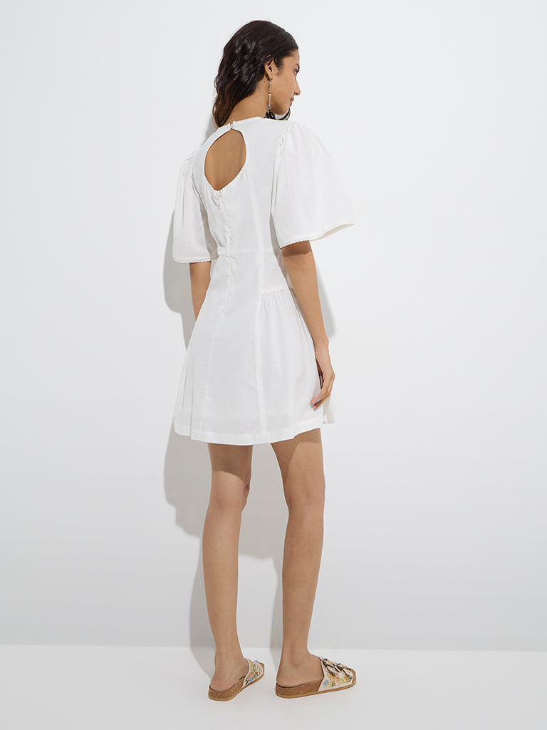 This white dress from Bombay Paisley captures a breezy charm with its graceful floral motifs and feminine detailing. Created from a soft cotton-blend fabric, it features a round neck trimmed with crochet accents and airy angel sleeves for a romantic touch. A stylish cut-out at the back adds a hint of allure, making it a perfect choice for sunlit days and easy-going outings.