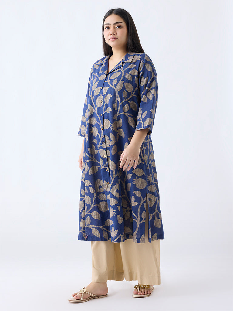 Diza Blue Floral Detailed A-Line Cotton Kurta