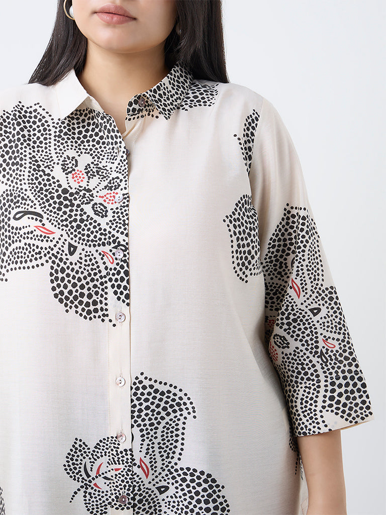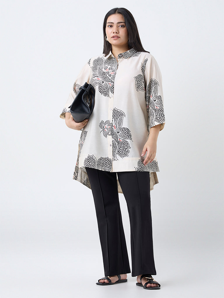 Decked with dainty floral motifs, this cream tunic from Diza brings a soft, contemporary edge to traditional styling. Made from breathable fabric, it features a structured collar, button-up front, three-quarter sleeves, and a high-low hemline for fluid movement.
