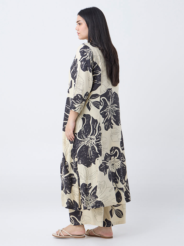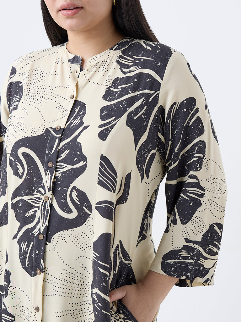 This off-white A-line kurta from Diza showcases a floral print in a contrasting hue for a graceful yet modern appeal. Designed with a band collar and button-down front, it features three-quarter sleeves and convenient side pockets, an elegant choice for effortless everyday style.