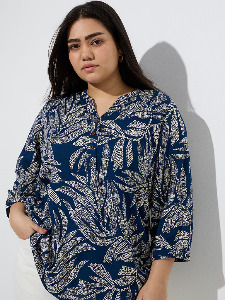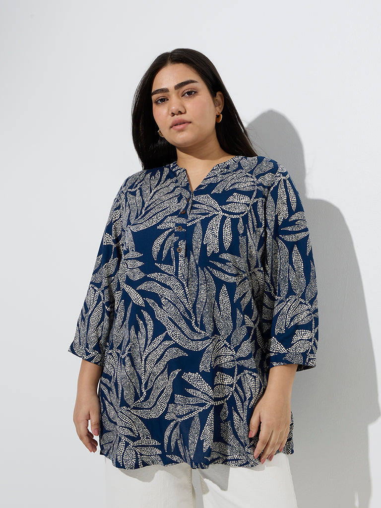 This teal ethnic kurti from Diza highlights foliage prints all over. Featuring a mandarin neck with a brief button placket and three-quarter sleeves, the breathable separate combines classic detailing with versatile style.