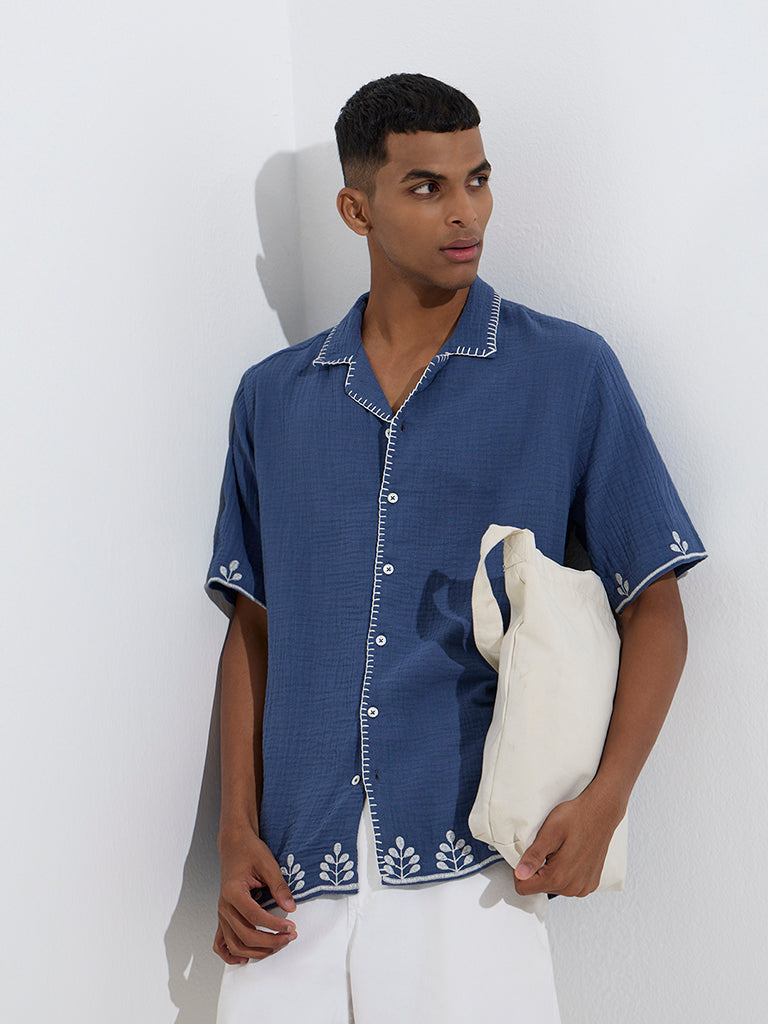 ETA Blue Embroidered Relaxed-Fit Cotton Shirt