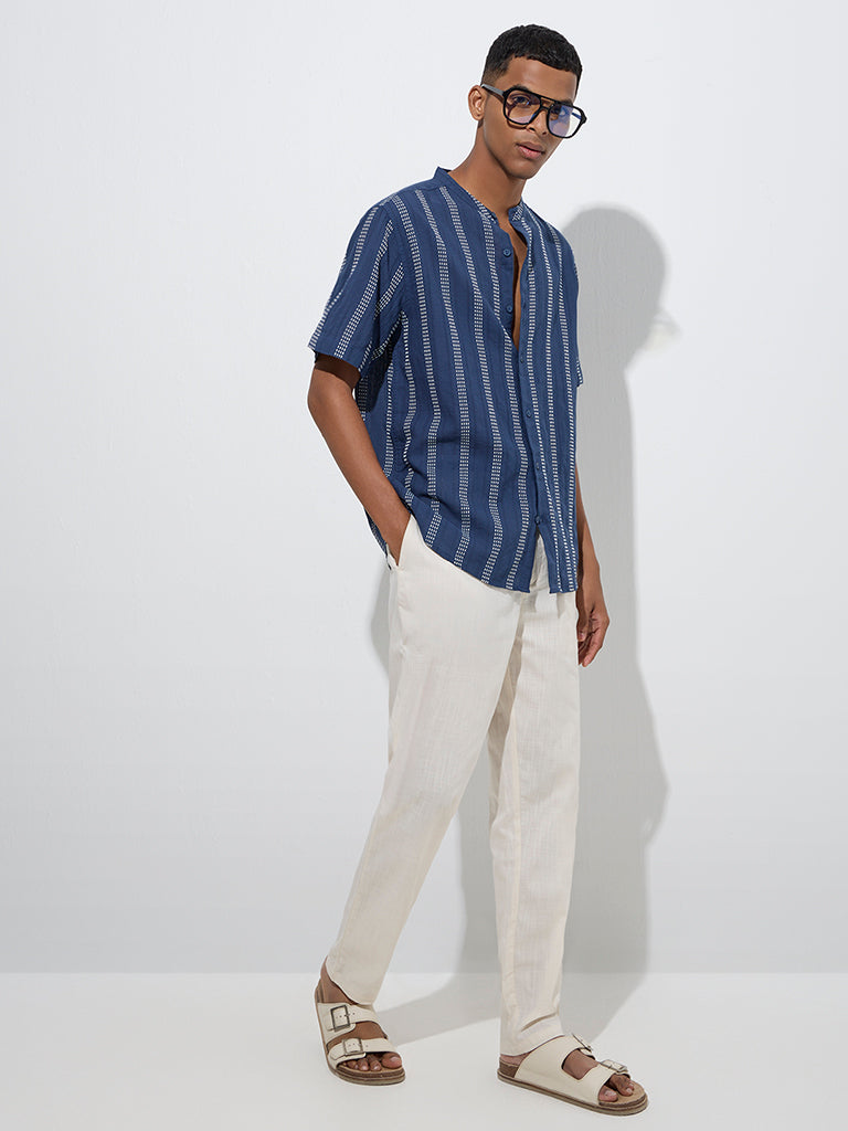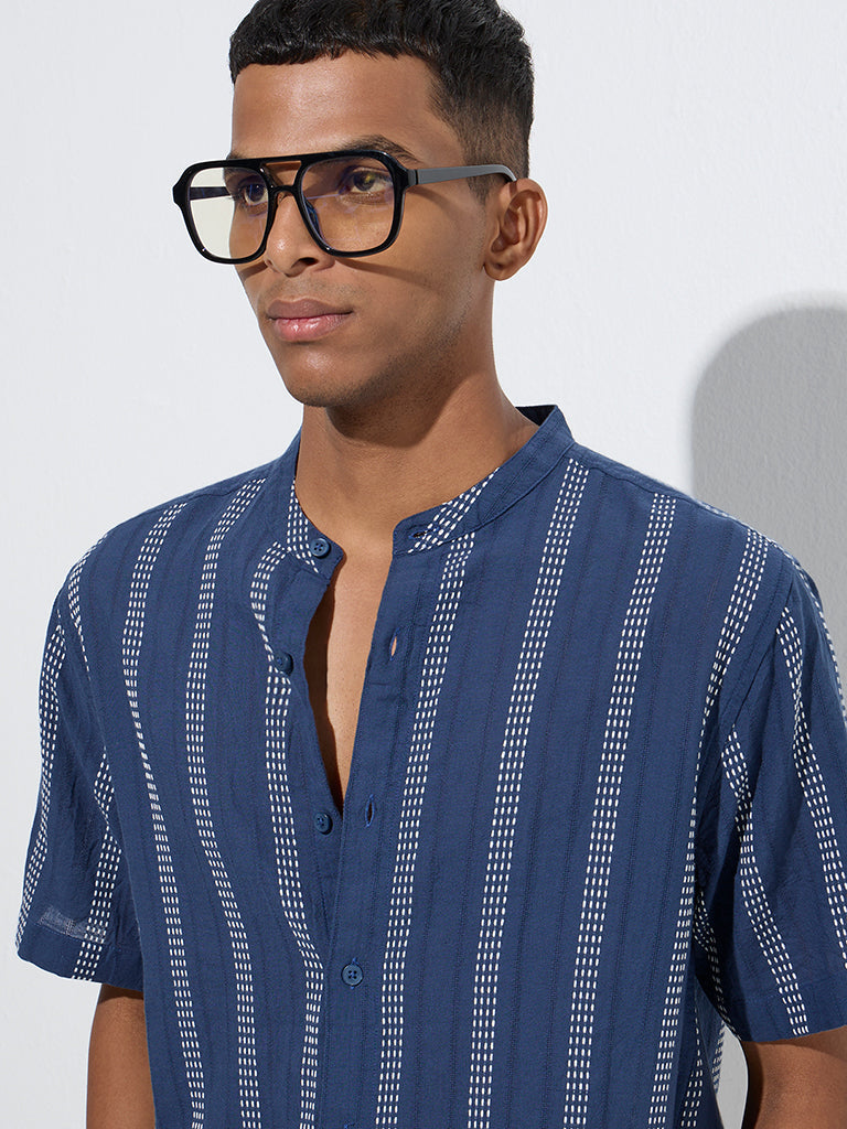 Embroidered with stripe patterns, this indigo shirt from ETA offers a refined yet casual appeal for warm-weather dressing. Spun from a cotton-rich fabric in a relaxed silhouette, it is styled with a mandarin collar, button placket, and half sleeves for everyday comfort.