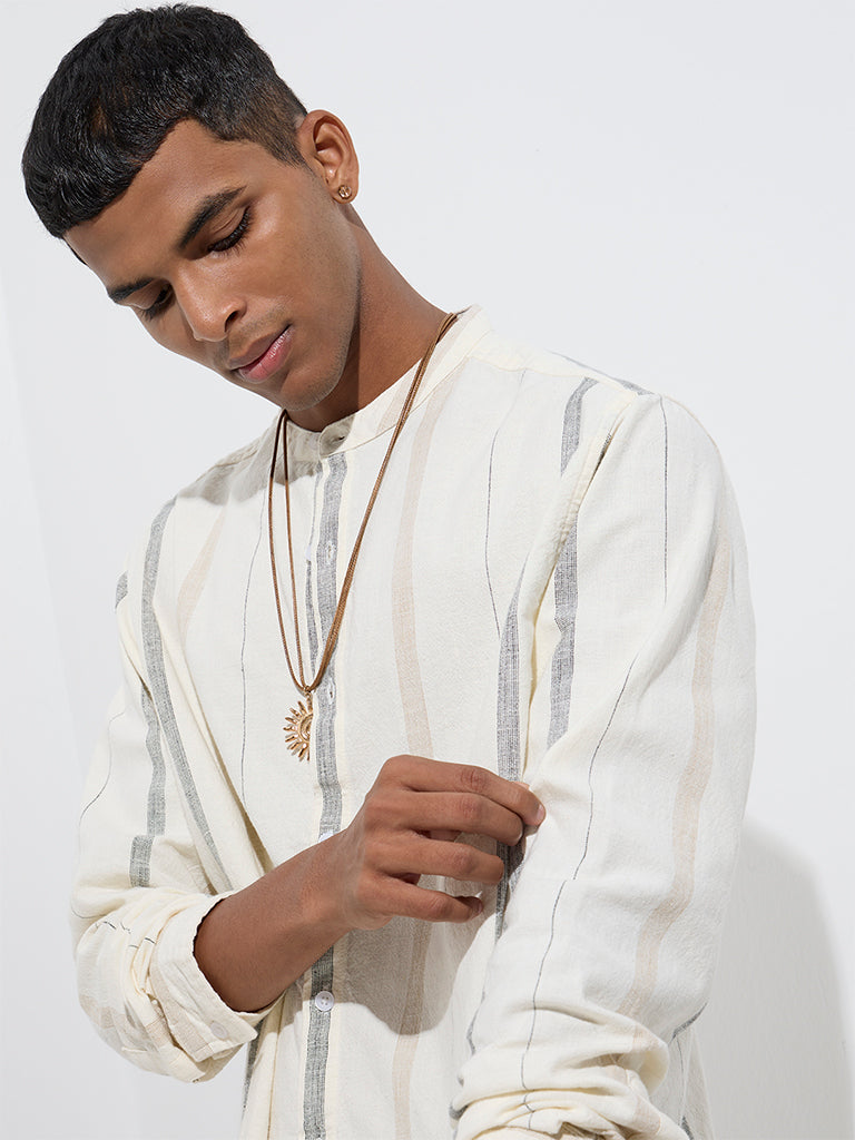 Defined with striped prints, this off-white shirt from ETA is tailored in a relaxed silhouette for effortless wear. Its cotton-linen blend ensures superior comfort, while the band collar, button placket, and full sleeves lend a polished finish.
