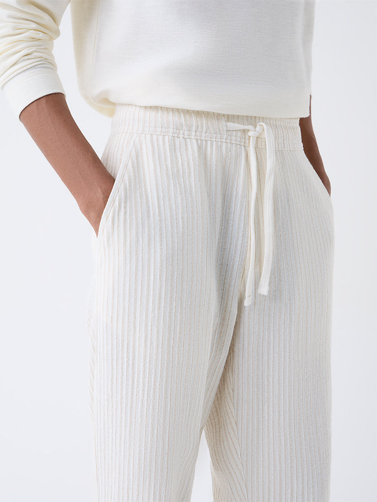 A laid-back essential, these off-white pants from ETA feature stripe patterns that add gentle structure to the relaxed silhouette. They are framed in a mid-rise waist and fitted with an elasticated drawstring waistband for an adjustable fit. Crafted from a cotton-rich fabric, they feel light and breathable.
