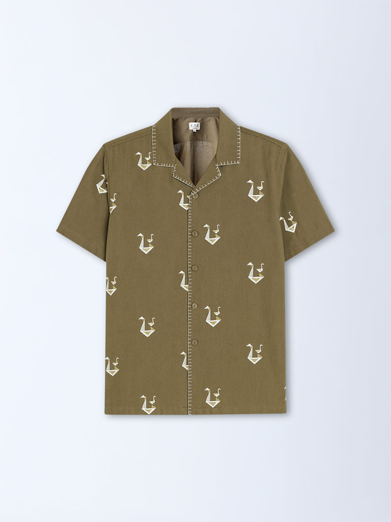 Add a hint of modernity to your holiday edit with this olive shirt from ETA. Shaped in a relaxed frame from a cotton-rich material, it flaunts distinct embroidered work that bring contemporary style to casual wear. Designed with a camp collar, button placket, and short sleeves, this versatile piece ensures breathable comfort for laid-back summer days.