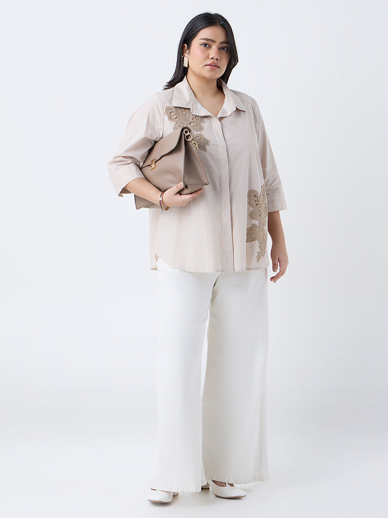Gia presents this pure cotton beige shirt, designed with intricate floral crochet work that exudes understated elegance. The striped pattern, notched collar, and concealed button-down front lend it a tailored touch, while the three-quarter sleeves complete its effortlessly refined look.