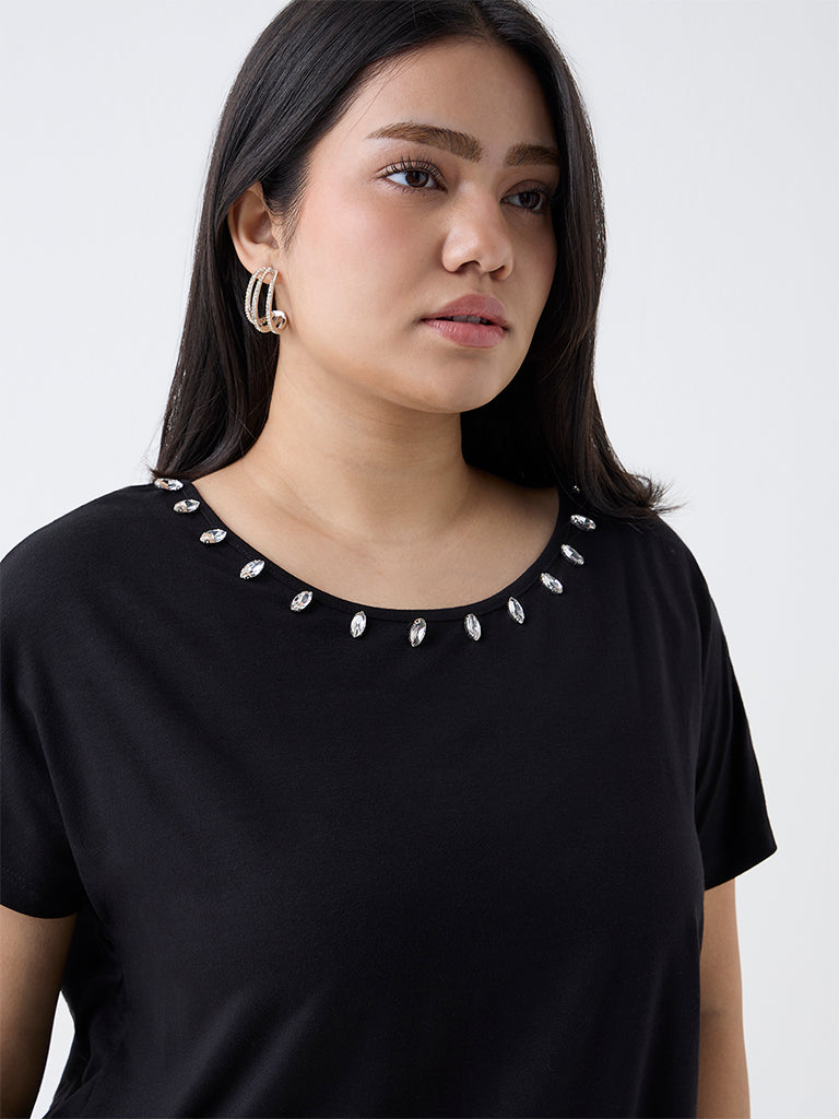 Gia introduces a touch of evening charm with this black top, styled with a graceful round neckline accented by sparkling diamanté detail. The relaxed silhouette and dolman sleeves create a fluid, flattering drape, while the asymmetric hemline adds a contemporary edge.