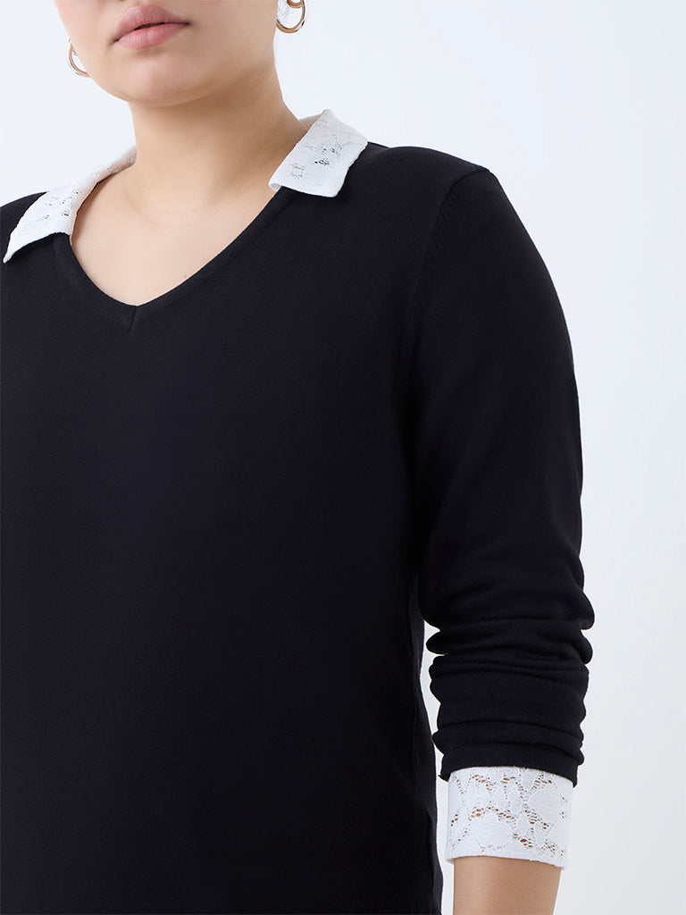 This black sweater from Gia is designed to take you from desk to dinner with quiet sophistication. Defined by its lace-detailed V-neck collar and cuffs, it is crafted from quality fabric and finished with full sleeves.