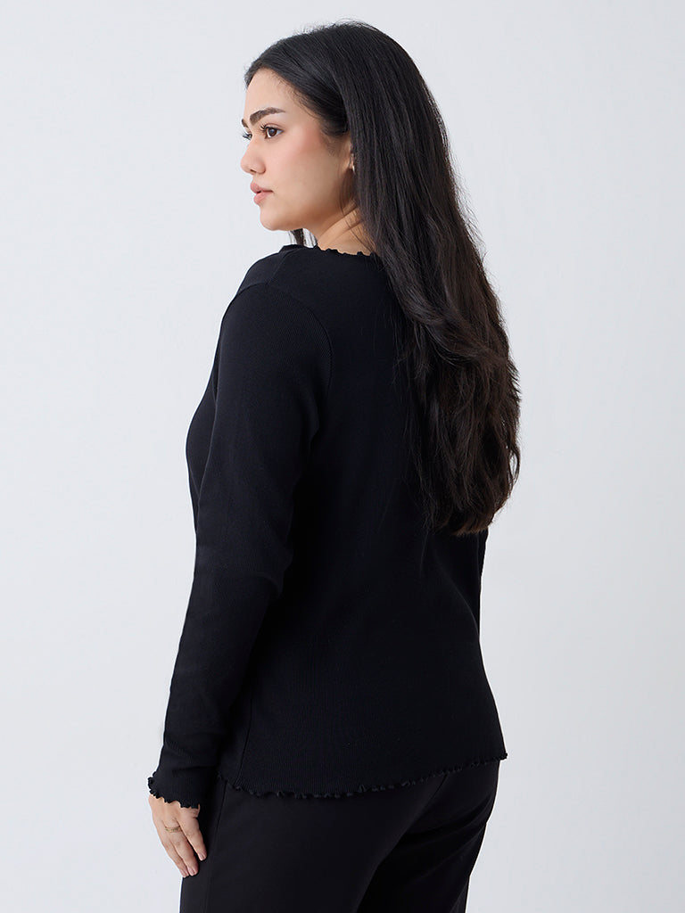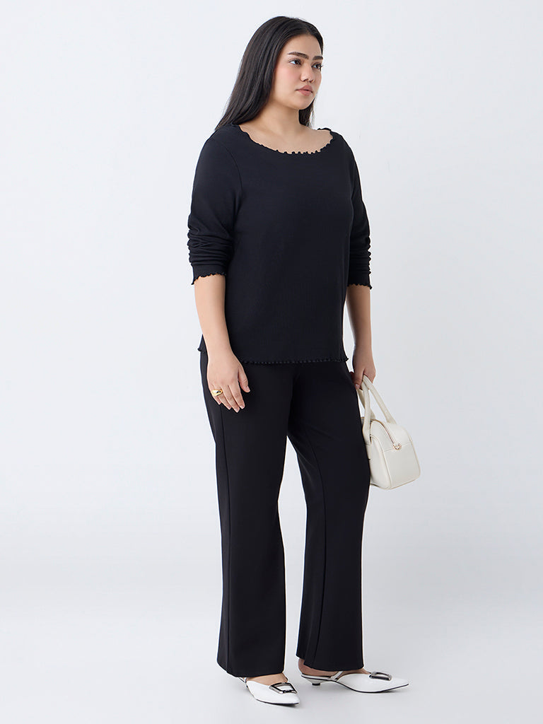 Add a touch of elegant comfort to your day with this black ribbed t-shirt from Gia. The textured fabric offers gentle stretch for a curve-loving fit, while the fluted boat neckline brings a soft, feminine finish. Full sleeves add cozy coverage, making it a chic choice for polished everyday dressing.