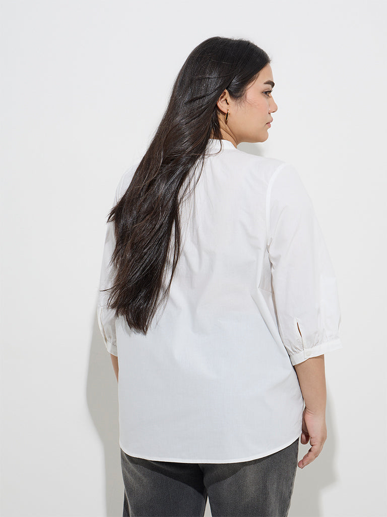 This white blouse from Gia combines delicate embroidery with a timeless silhouette. Featuring a mandarin neckline that extends into a button placket and three-quarter sleeves, it offers an elegant yet effortless charm.