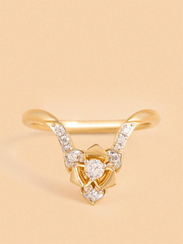 Westside X Pome presents this gold multilayer rose V ring, designed with a polished gold-tone band that elegantly splits into a V-shape design, adorned with clear stones. At the center, a layered rose motif is accented with additional clear stones, enhancing its intricate detailing and charm.