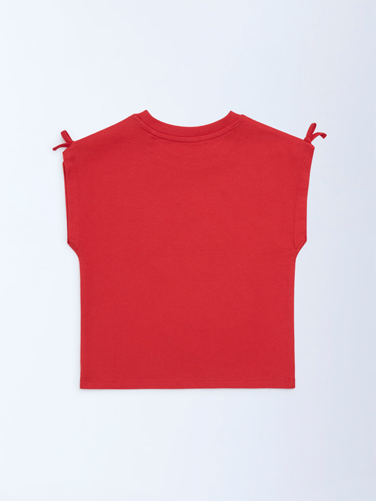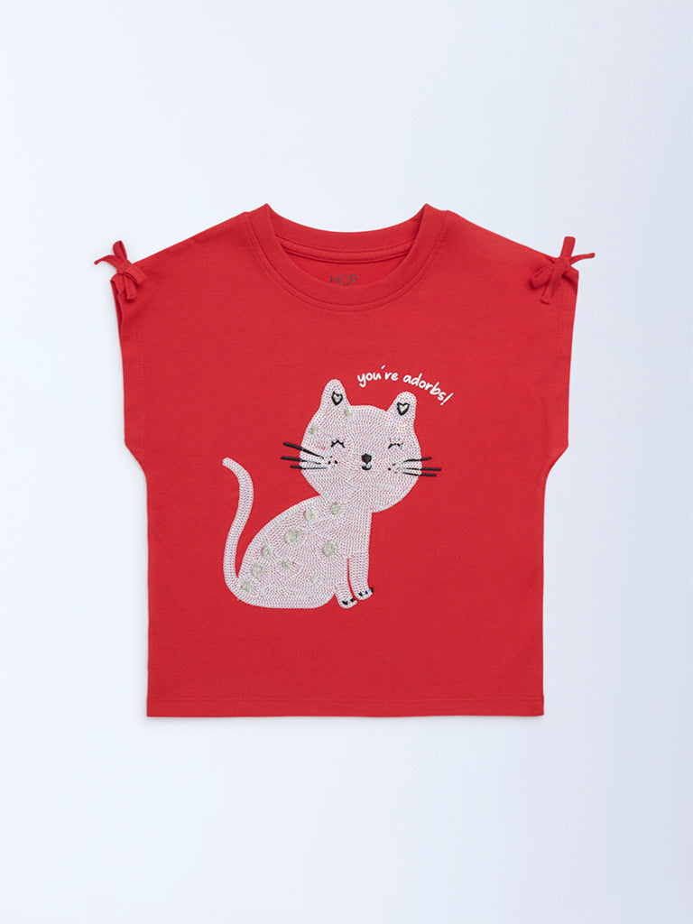HOP Kids Girls Red Embellished Cotton T-Shirt