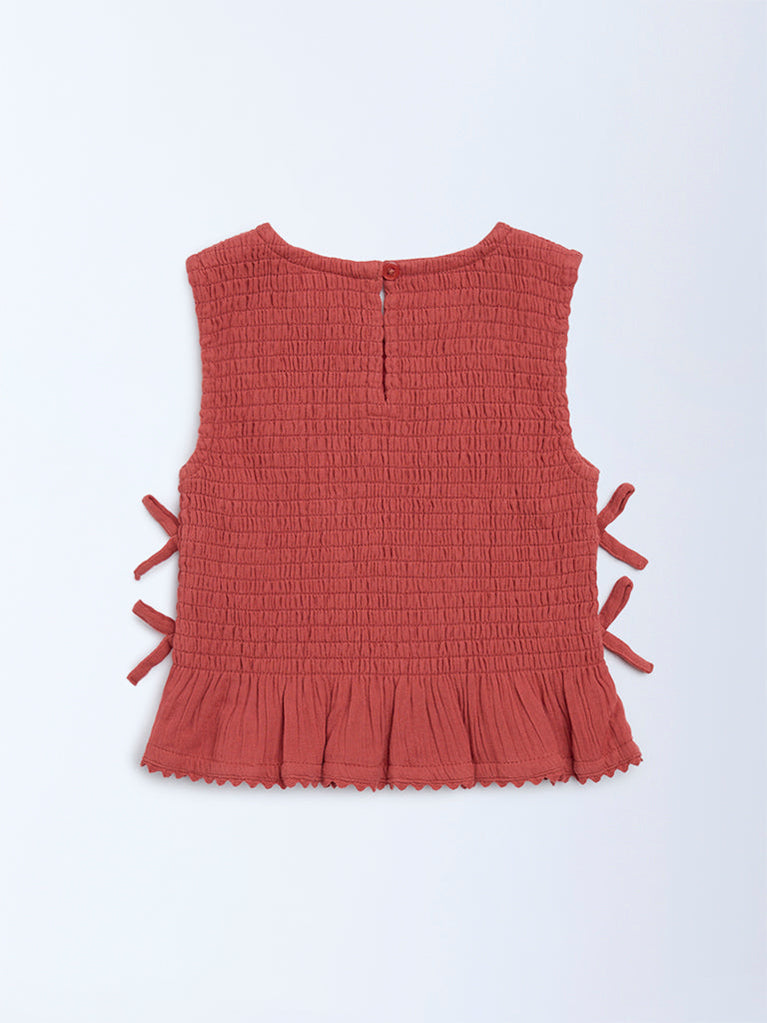 Designed for easy everyday styling, this rust top from HOP Kids features a smocked bodice for a comfortable, flexible fit. Made from pure cotton, it’s finished with a round neckline, sleeveless cut and a cute bow detail at the front.