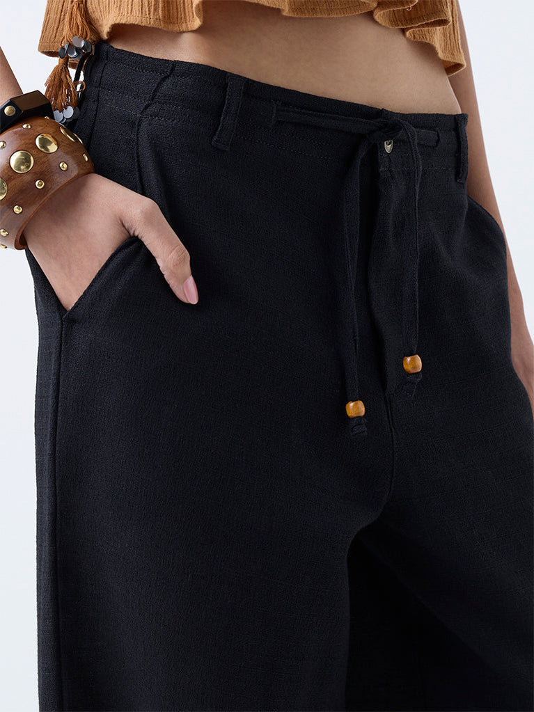These black pants from Bombay Paisley offer a versatile base for both relaxed and refined looks. The cotton-blend fabric keeps them lightweight and easy to wear, while the buttoned waistband and drawstring tie strike a balance between structure and comfort. Finished with functional side pockets, they’re an effortless choice for everything from weekday errands to evening plans.