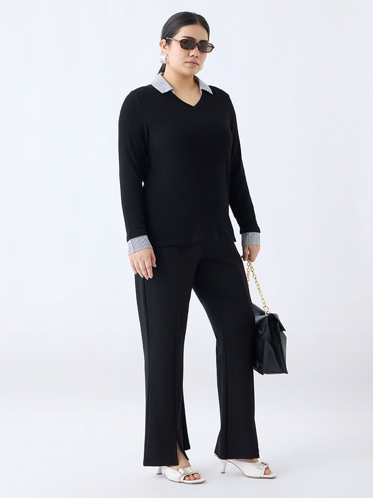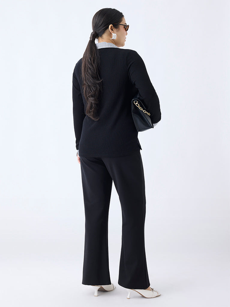 Make a fashion statement with this black tee from Gia. Crafted in a lightweight knitted texture for added comfort, it flaunts a contrast striped collar and cuffs for a touch of modernity.