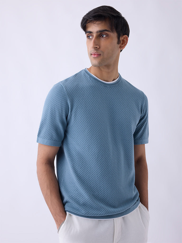 ETA Dusty Blue Woven-Textured Relaxed-Fit Cotton T-Shirt