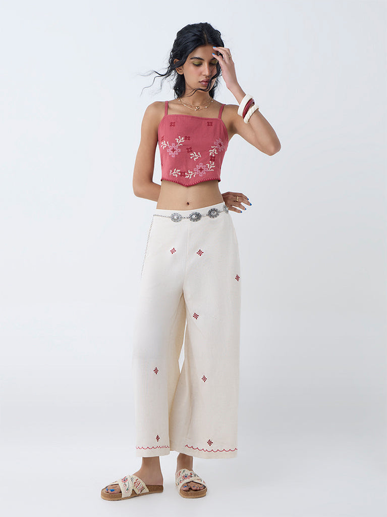 Add a touch of sophistication to your weekend edit with this dusty pink top from Bombay Paisley. Cross-stitched floral embroidery brings artisanal detail, while a cropped silhouette keeps it breezy and modern. Designed with a square neck, adjustable straps, and a smocked back, it offers a comfortable fit.