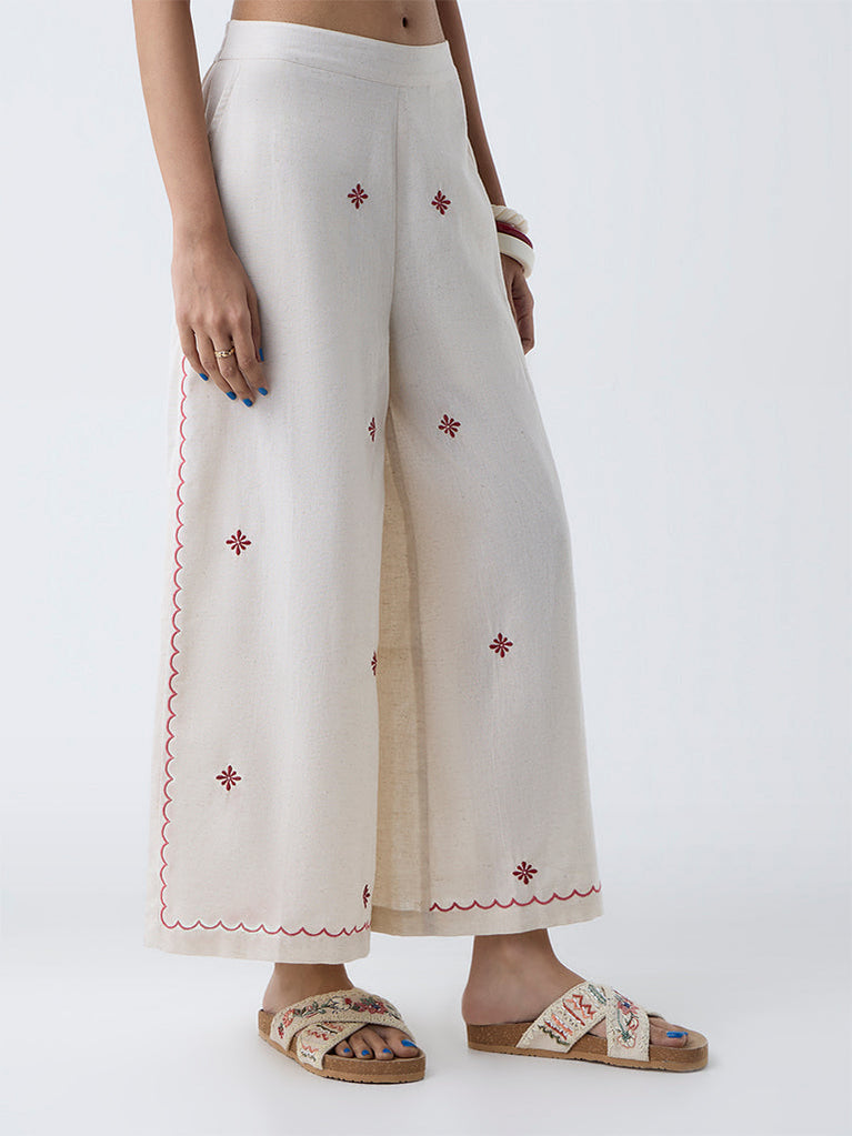 Move through your day with ease and style in these off-white palazzos from Bombay Paisley. Milled from a cotton-rich fabric for daily comfort, they come fitted with an elasticated waistband and side pockets. The delicate floral embroidery throughout accentuates its appeal.
