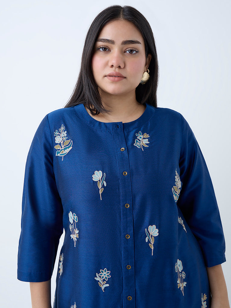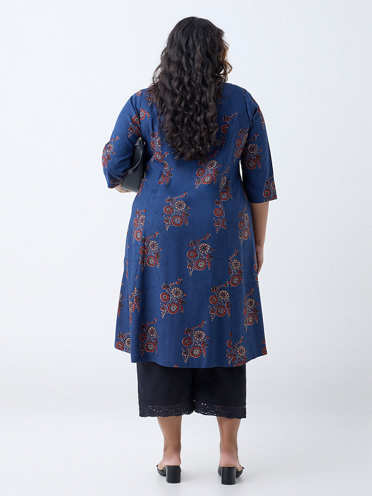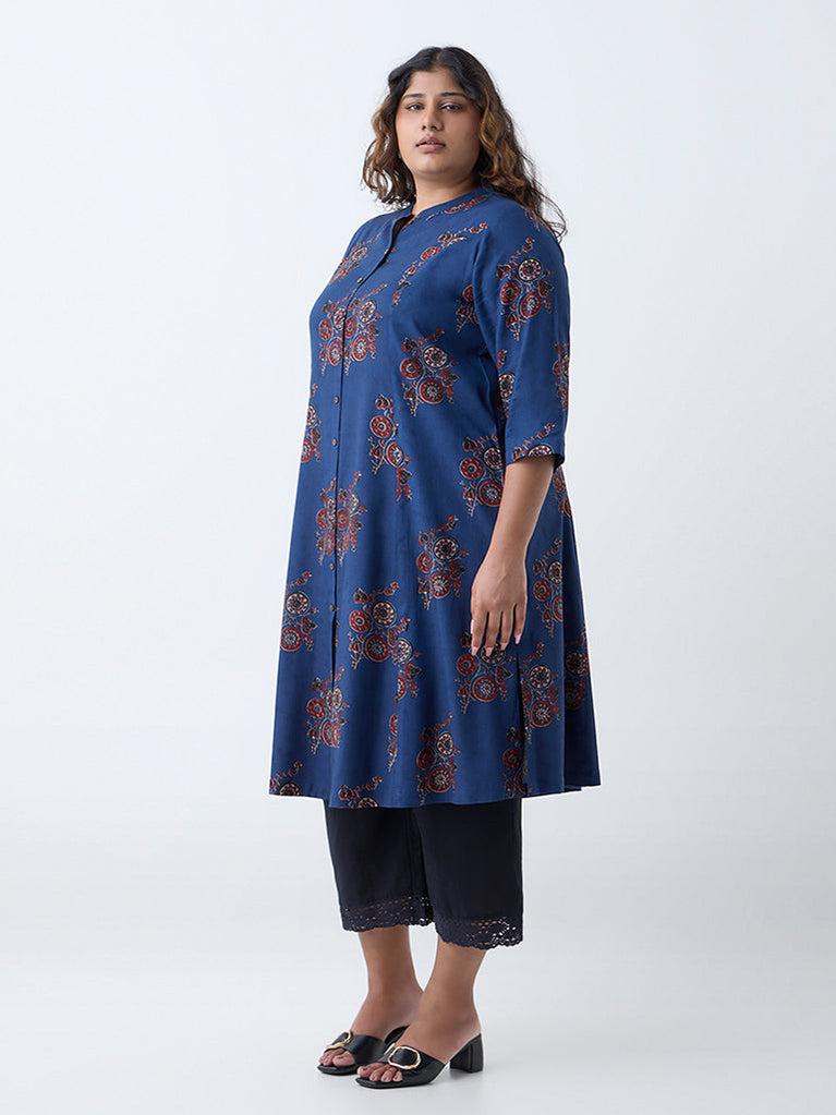 Diza Blue Floral Detailed A-Line Cotton Kurta