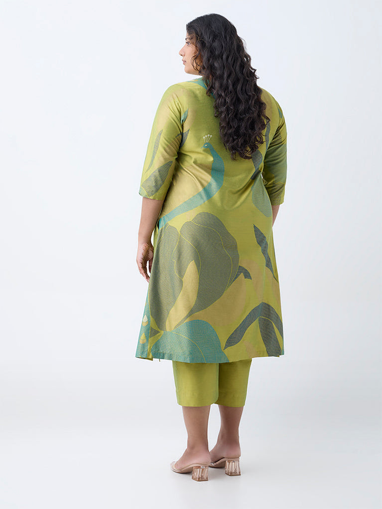 Diza Green Jamdani-Printed Cotton-Blend A-Line Kurta
