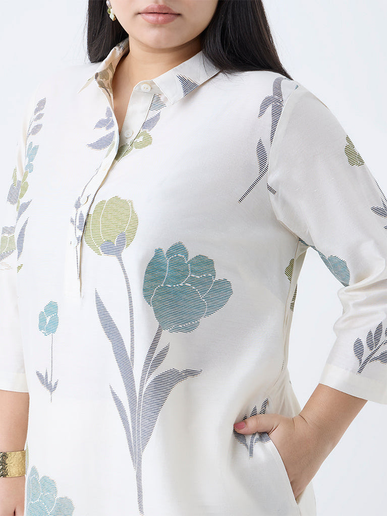 This off-white kurta from Diza is adorned with graceful floral motifs for feminine appeal. Carved in a straight silhouette, it features a smart collar with a brief button placket, three-quarter sleeves, and a slip pocket for everyday ease.