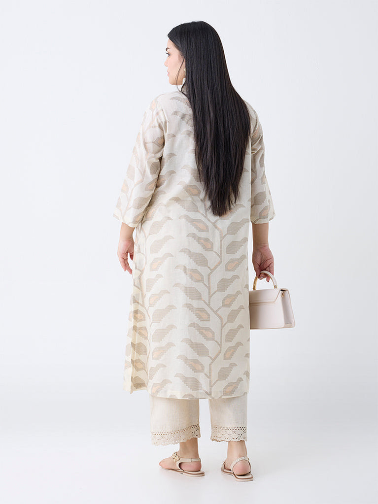 Diza Off-White Botanical Design Cotton-Blend A-Line Kurta