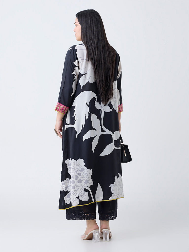 Diza brings you this charming black A-line kurta, featuring graceful floral prints that add a hint of femininity. Styled with a refined spread collar leading to a brief button-down front, three-quarter sleeves, and convenient side pockets, it combines effortless elegance with practical design.