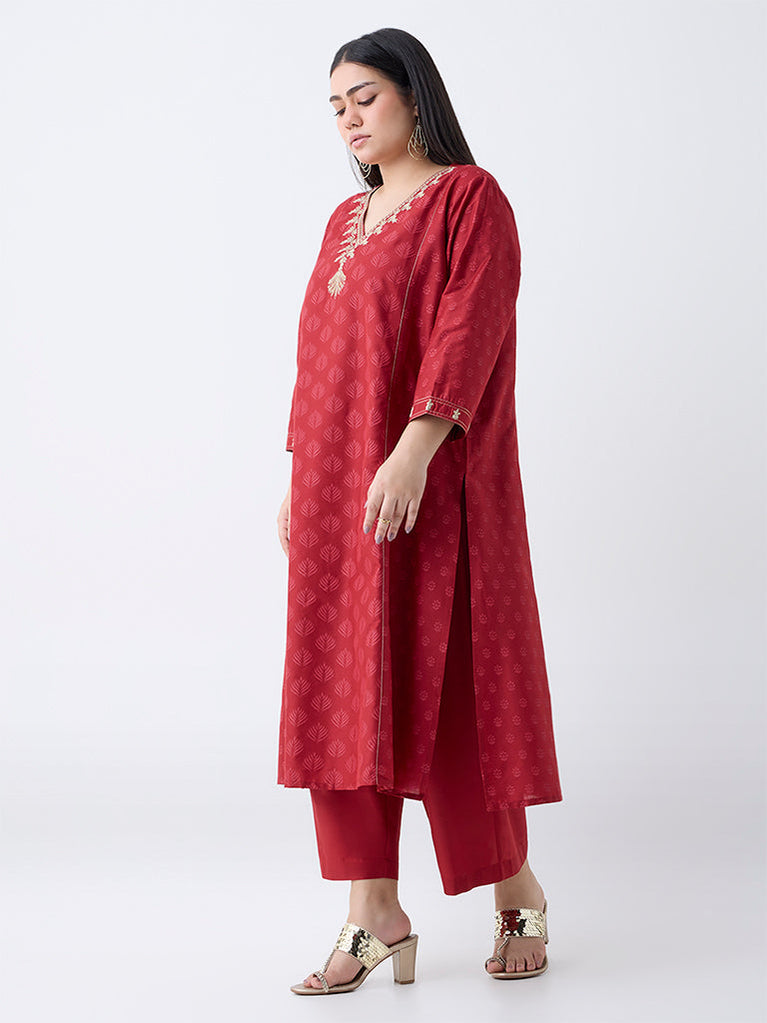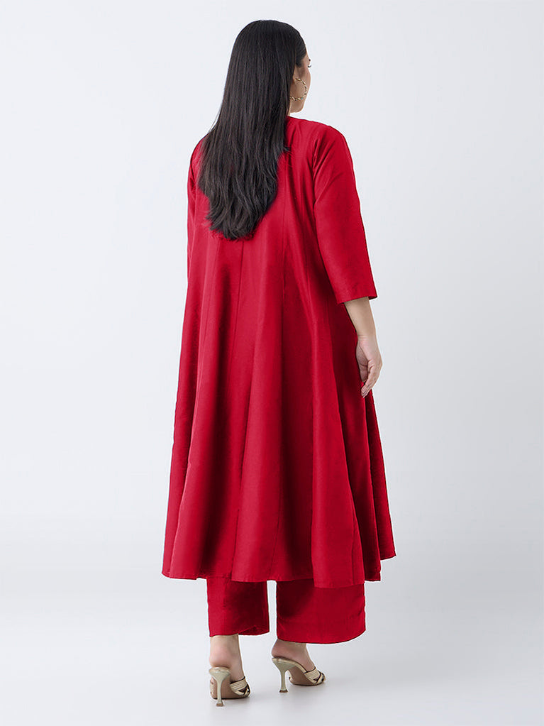 Infused with artisanal grace, this red kurta by Diza is detailed with floral embroidery and subtle embellishments for a festive sparkle. The Anarkali silhouette flows elegantly, balanced by a flattering V-neck and three-quarter sleeves. Side pockets add a modern touch of ease to this traditional design.