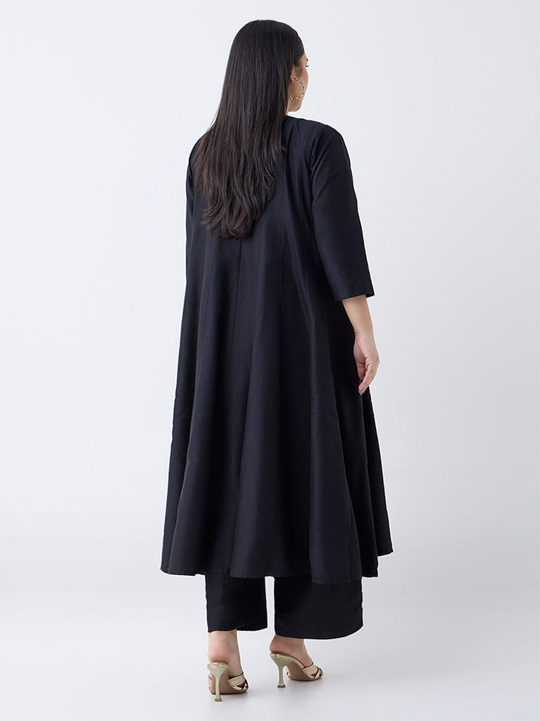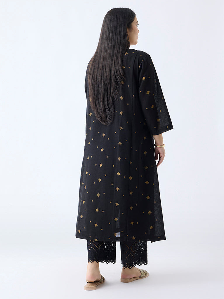 This black kurta from Diza stands out with its subtle embellishments across an A-line frame. Spun from a premium fabric blend, it features a V-neck and three-quarter sleeves for a composed finish. A refined option that transitions effortlessly through everyday ethnic wear.