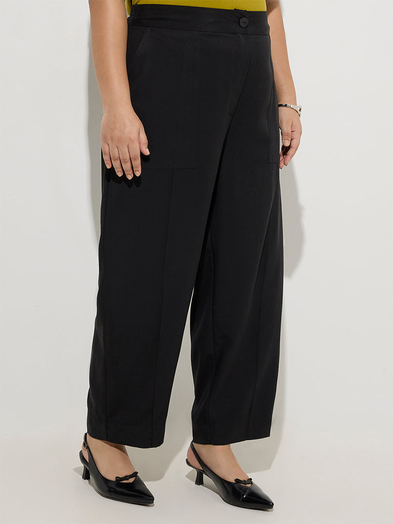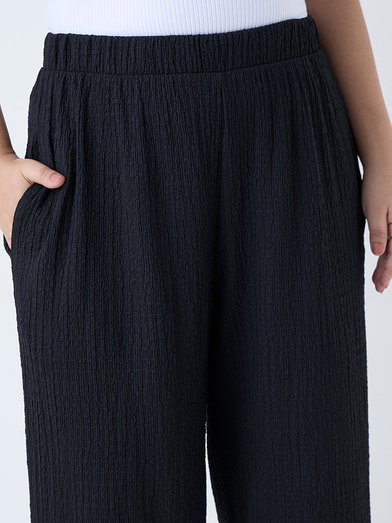 Elevate your style quotient with these black pants from Gia. Crafted from a crinkle-textured fabric for ultimate comfort, they feature a smooth elasticated waistband and side pockets for all-day ease and functionality.