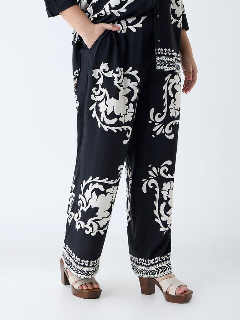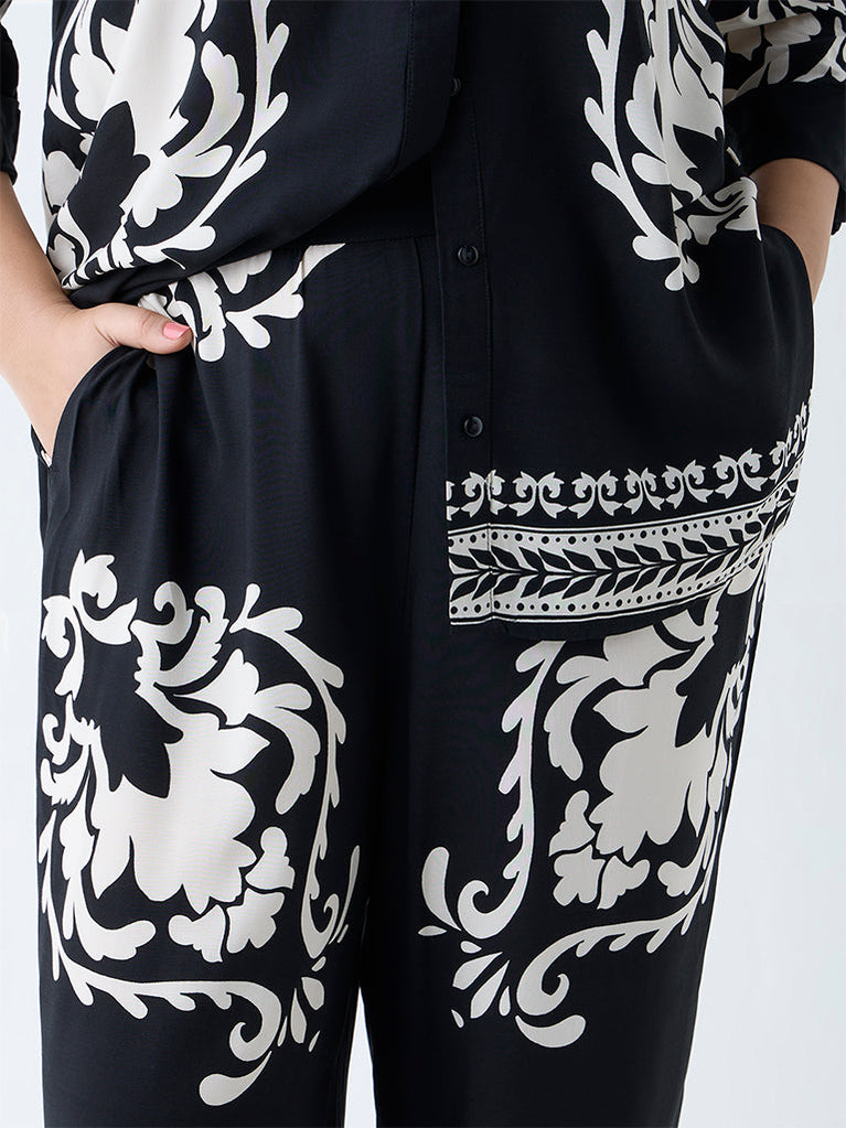 Elevate your style quotient with these black trousers from Gia, adorned with striking baroque-inspired prints. Spun from a breathable fabric, they feature a smooth elasticated waistband for comfort and side pockets for added utility.