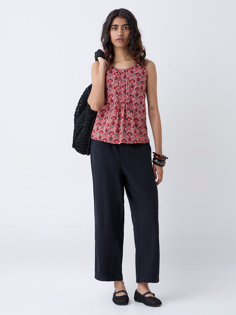 A pop of colour for everyday styling, this red top from Bombay Paisley showcases vivid ethnic prints with a refined finish. Crafted from breathable cotton, it features pintuck detailing and a short button placket that adds texture. The round neckline and sleeveless cut keep it light, comfortable and ideal for warm-weather layering.