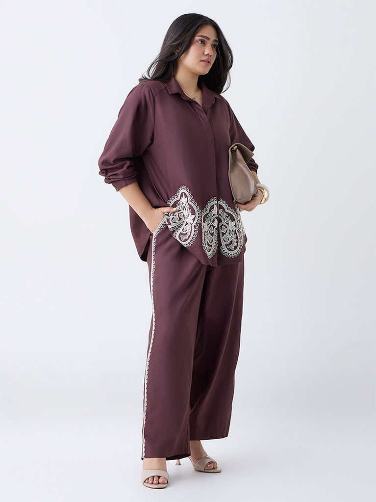 This dark brown shirt by Gia is beautifully detailed with intricate embroidery that brings depth and dimension to its refined design. Crafted from a sumptuous, drapey fabric that skims the body with ease, it features a structured collar and a concealed button placket for a clean, elongating front. Full sleeves with buttoned cuffs create a tailored finish perfect for dressing up denim or pairing with coordinated trousers.