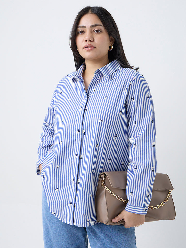 This blue shirt by Gia is elevated with delicate floral embroidery layered over a striped base, creating a refined blend of pattern and texture. Made from pure cotton for breathable comfort, it features a crisp collar that extends to a concealed button placket and full sleeves finished with buttoned cuffs.
